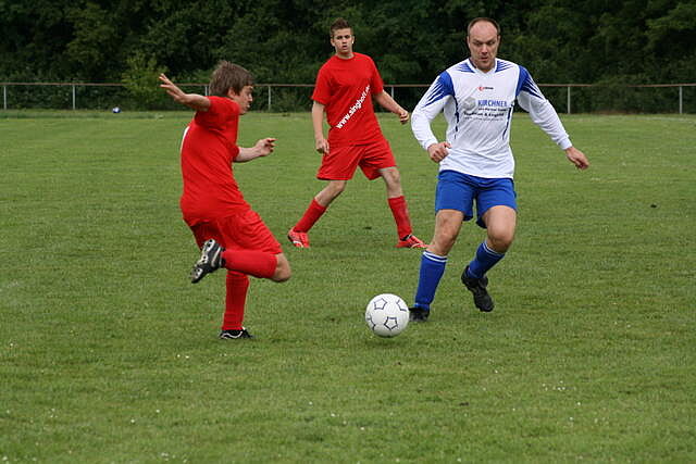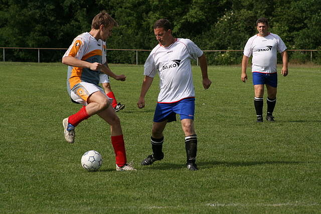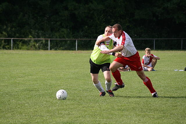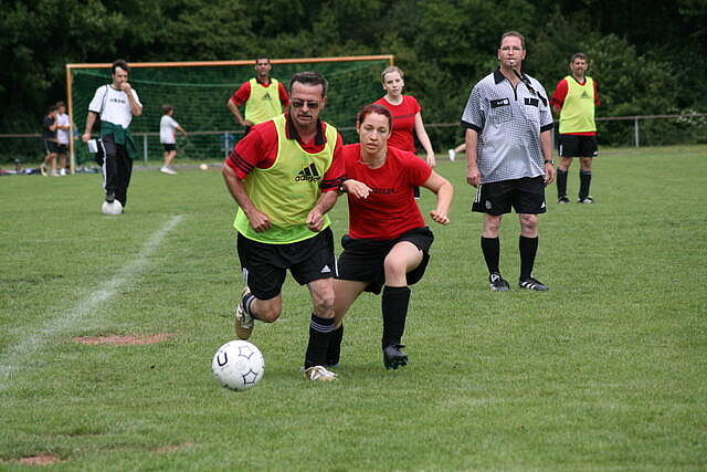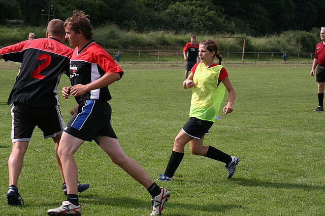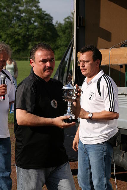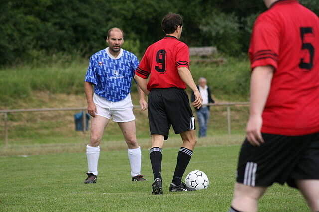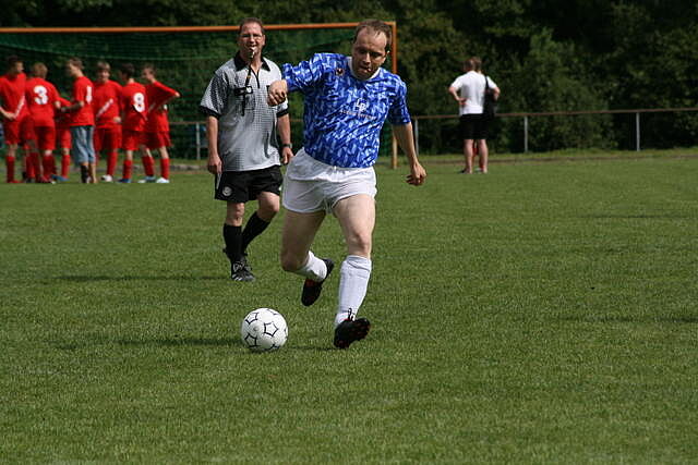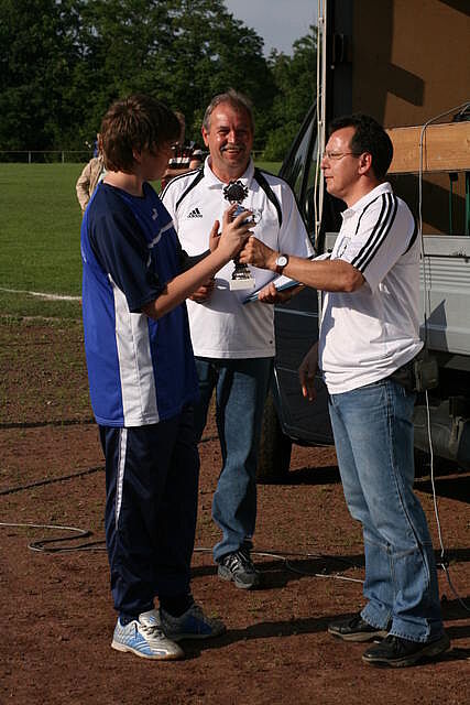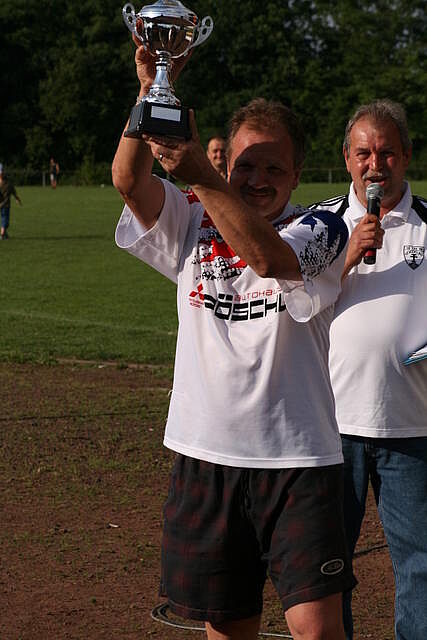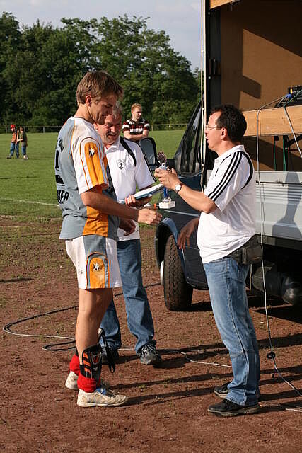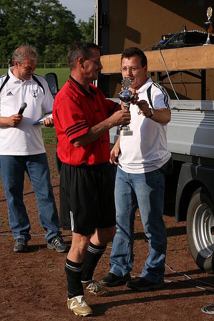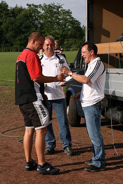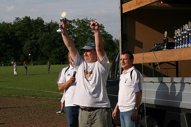 Erfreulich war, dass es durchweg faire Spiele waren und auch zwischendurch einsetzender Regen die Laune nicht trübte. So war die Hüpfburg vor und nach der Regenpause genauso beliebt, wie das Spielmobil des Kinderschutzbundes. Auch von einer kurzfristig organisierten Tombola wurde reichlich Gebrauch gemacht. Das Torwandschießen gewann Ruben Kiroff im Stechen gegen Martin Schulz. Bei den Kindern sorgte Robin Borger mit 4 Treffern für einen neuen Rekord und erhielt ebenfalls einen Pokal. Als fairste Mannschaft wurde das Manndeckerteam ausgezeichnet. Nach der Siegerehrung sorgte die Gruppe „Soundwave“ für Stimmung und es wurde bis nach Mitternacht das Tanzbein geschwungen.