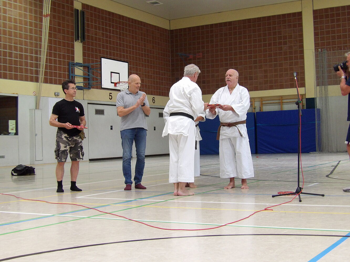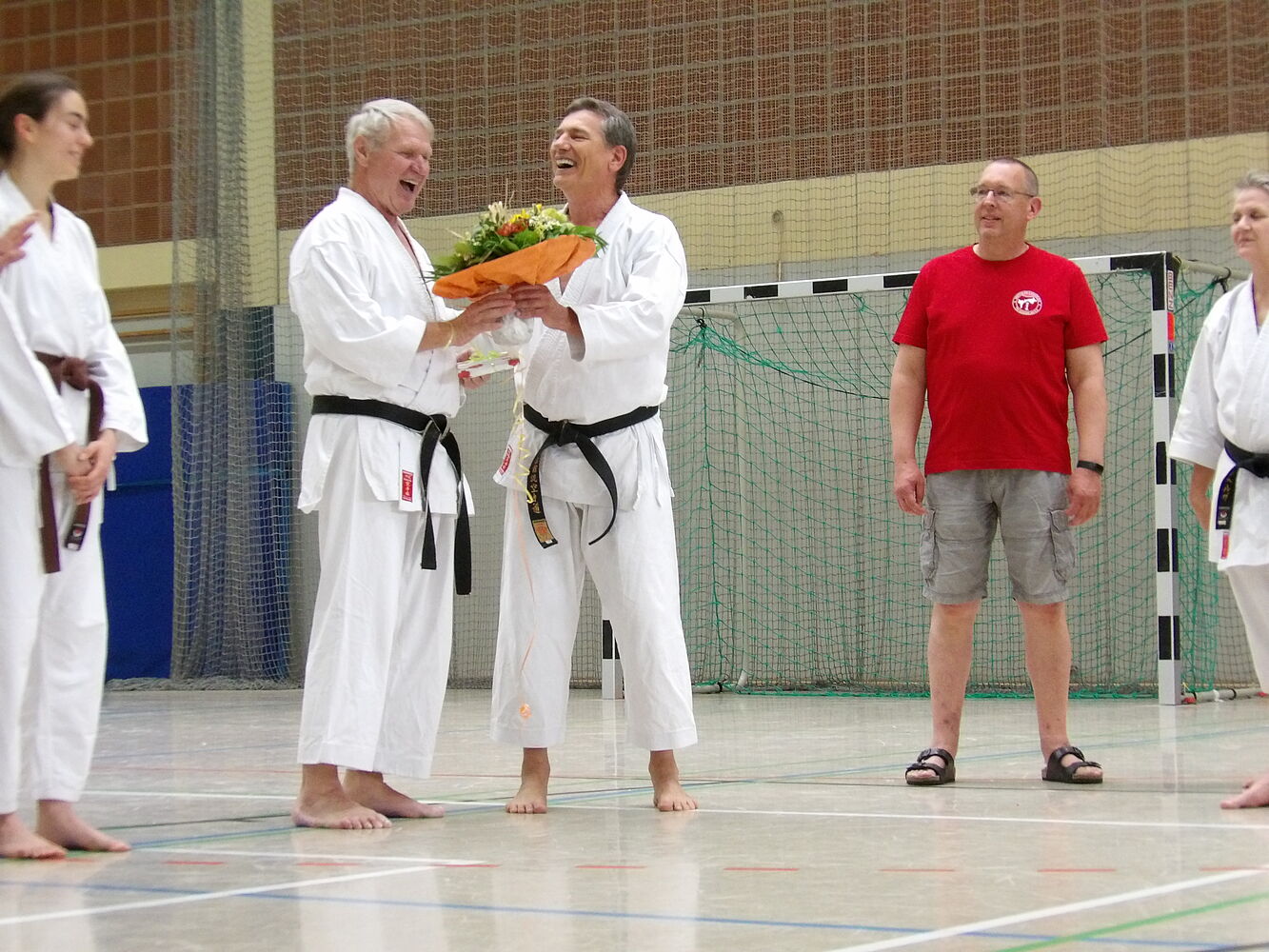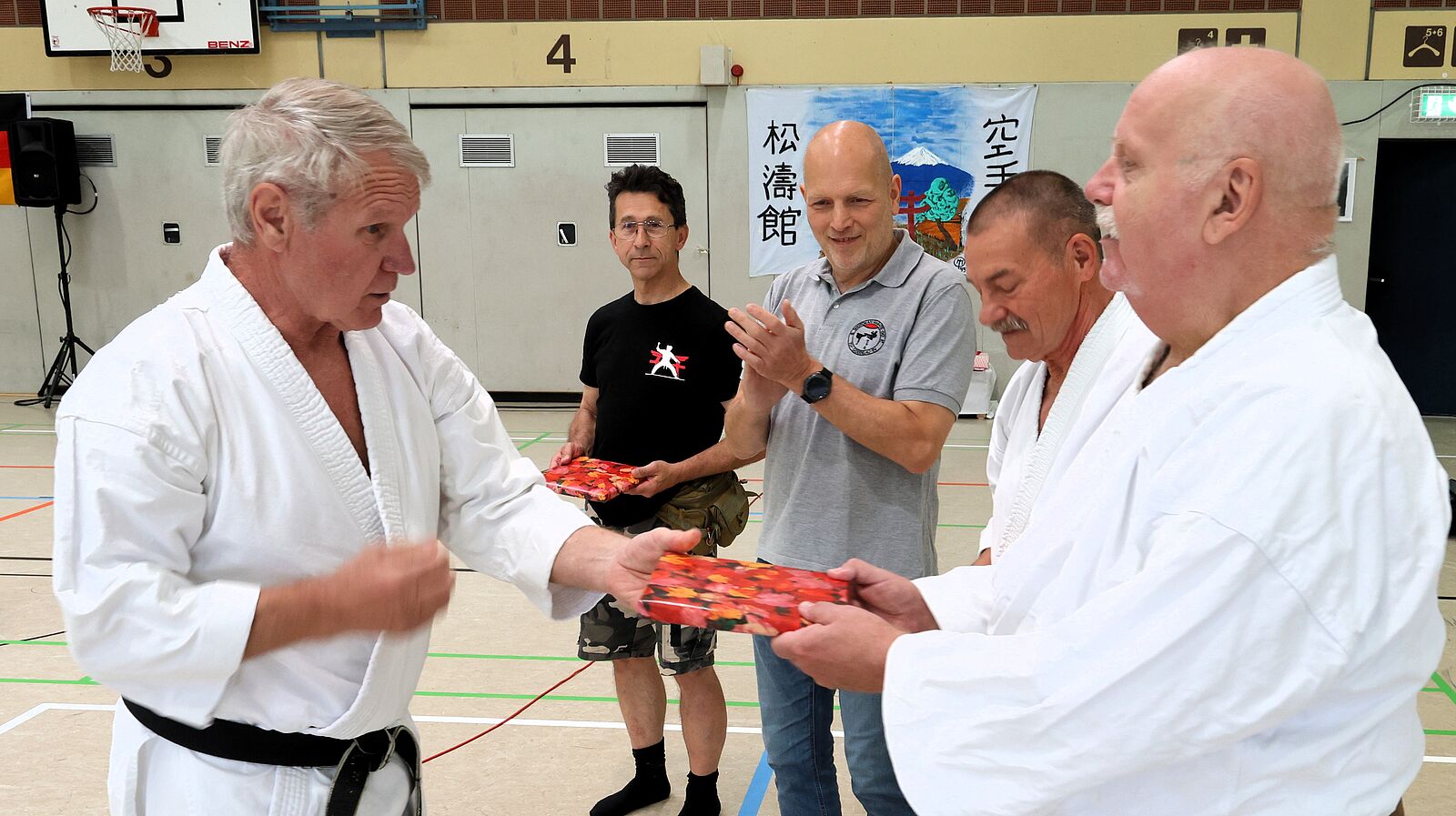 Abschließend ergriff Großmeister Kyoshi ('Lehrer der Lehrenden') Lothar Josef Ratschke das Wort und dankte seinem Freund und Weggefährten Wolfgang Brzezicki für mehr als 50 Jahre Freundschaft und beispielhaftes Voranschreiten auf dem Karate-Do und überreichte ebenfalls ein Präsent.