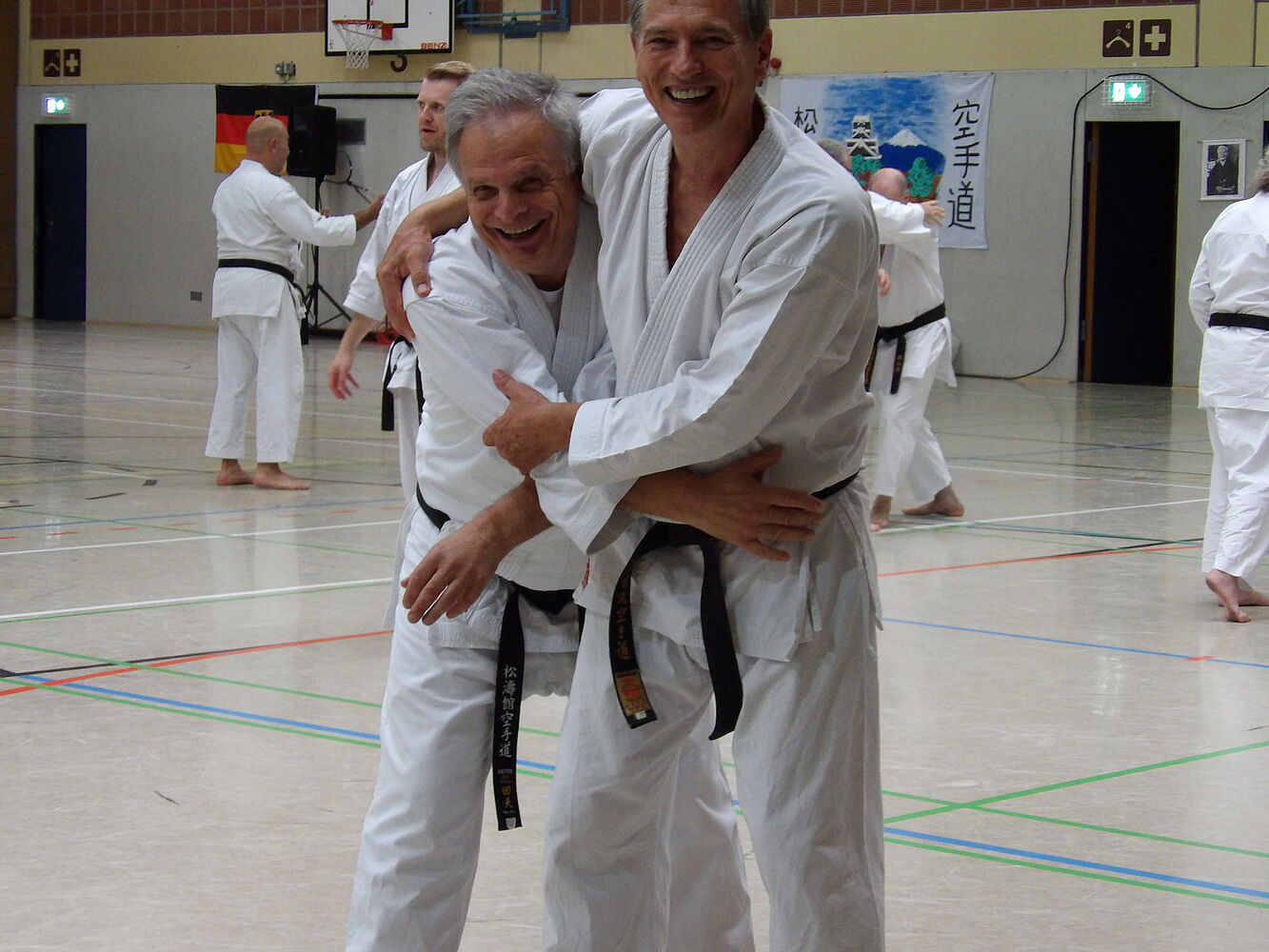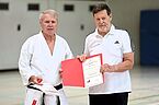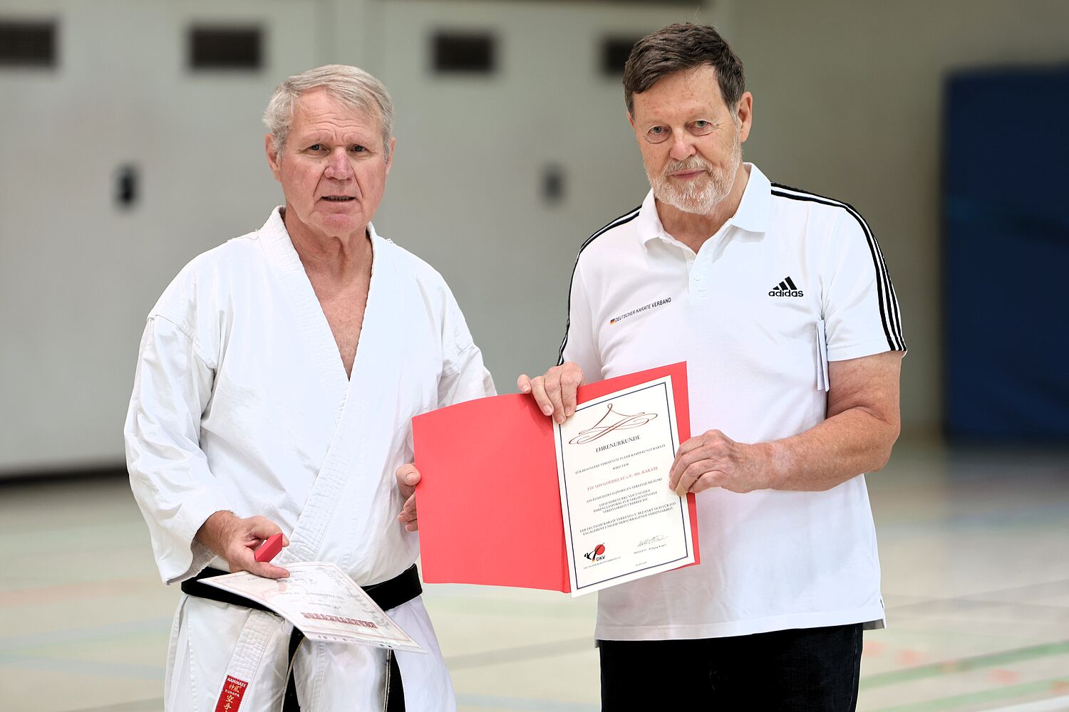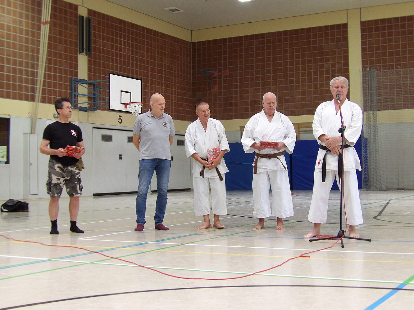 Abschließend ergriff Großmeister Kyoshi ('Lehrer der Lehrenden') Lothar Josef Ratschke das Wort und dankte seinem Freund und Weggefährten Wolfgang Brzezicki für mehr als 50 Jahre Freundschaft und beispielhaftes Voranschreiten auf dem Karate-Do und überreichte ebenfalls ein Präsent.