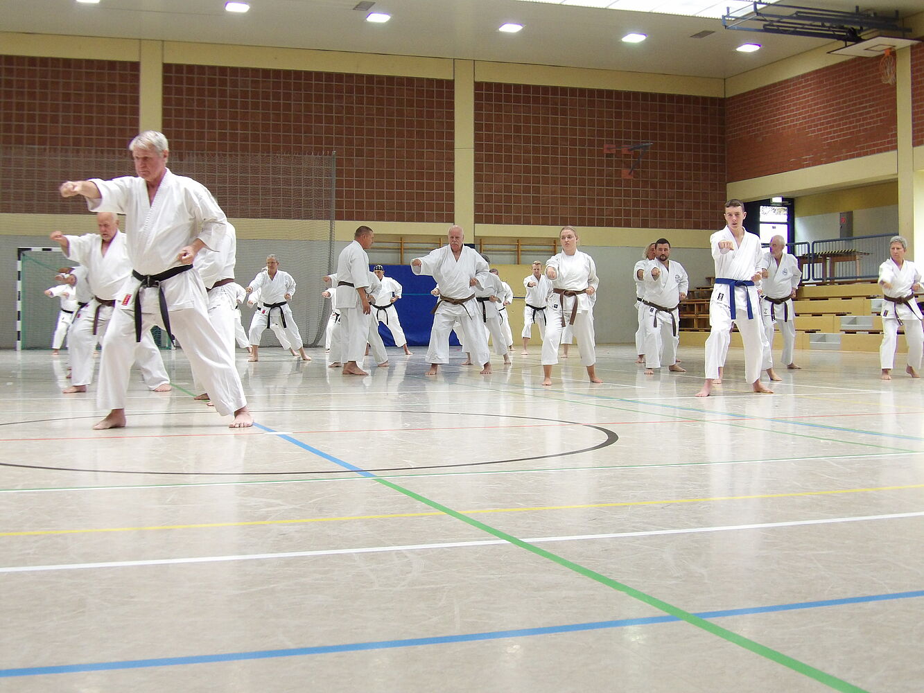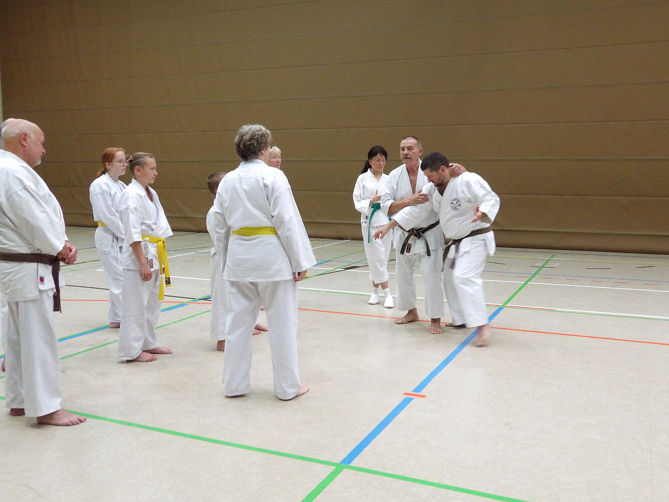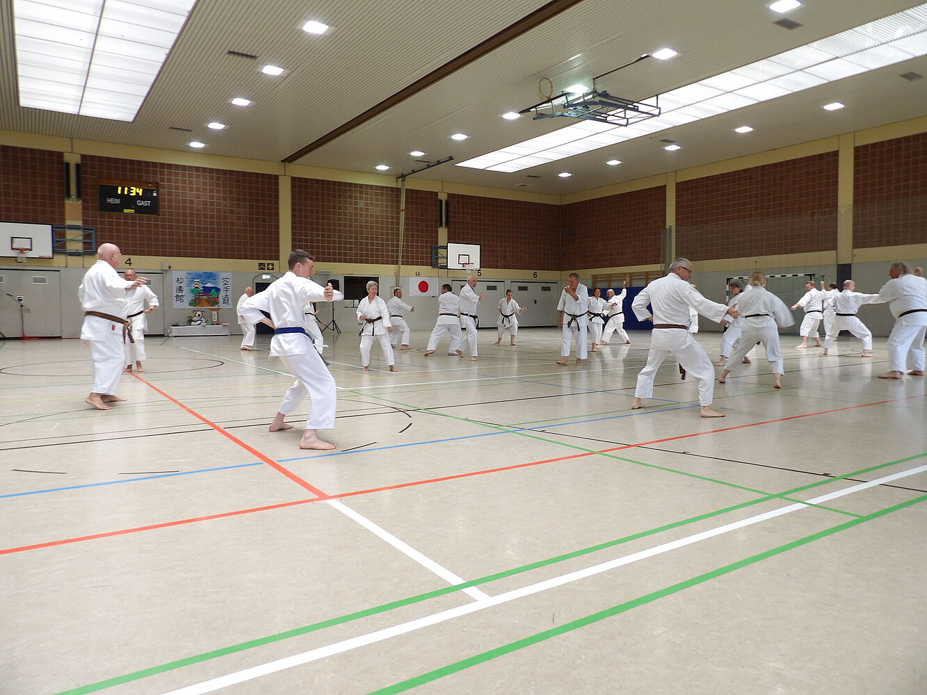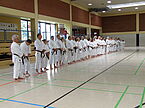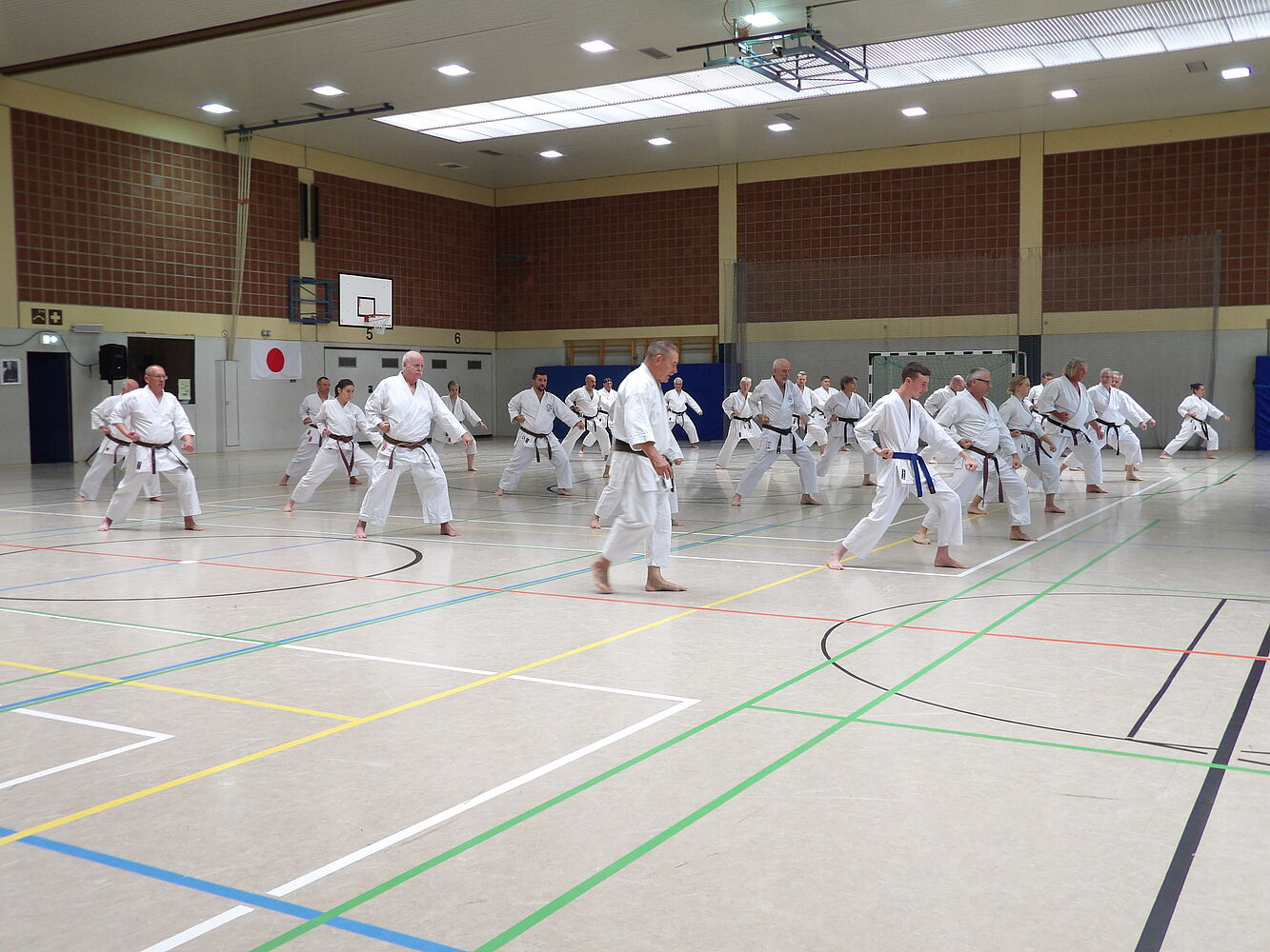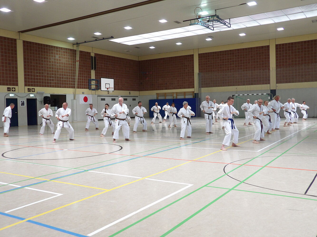 Sodann begann der Hauptpunkt der Veranstaltung, ein vom Deutschen Karate Verband e.V. bundesweit ausgeschriebener Lehrgang mit Großmeister Lothar Josef Ratschke (8. Dan). Es wurden anspruchsvolle Karate-Kombinationen und deren effektive Anwendung in unterschiedlichen Kampfsituationen geübt. Besonderer Wert wurde auf die gesundheitsbewusste und biomechanisch korrekte Ausführung der einzelnen Bewegungen gelegt. In der Oberstufe lag der Trainingsschwerpunkt auf der Kata Jion ('Liebe und Gnade') in der Unterstufe wurden Heian Shodan und Heian Nidan geübt.