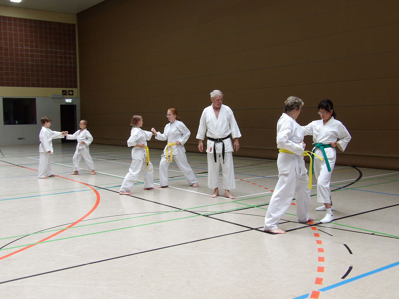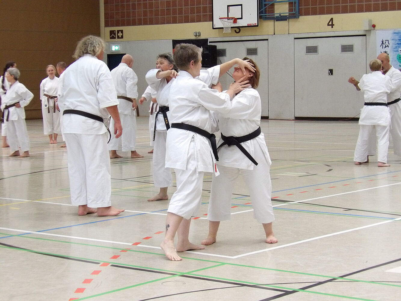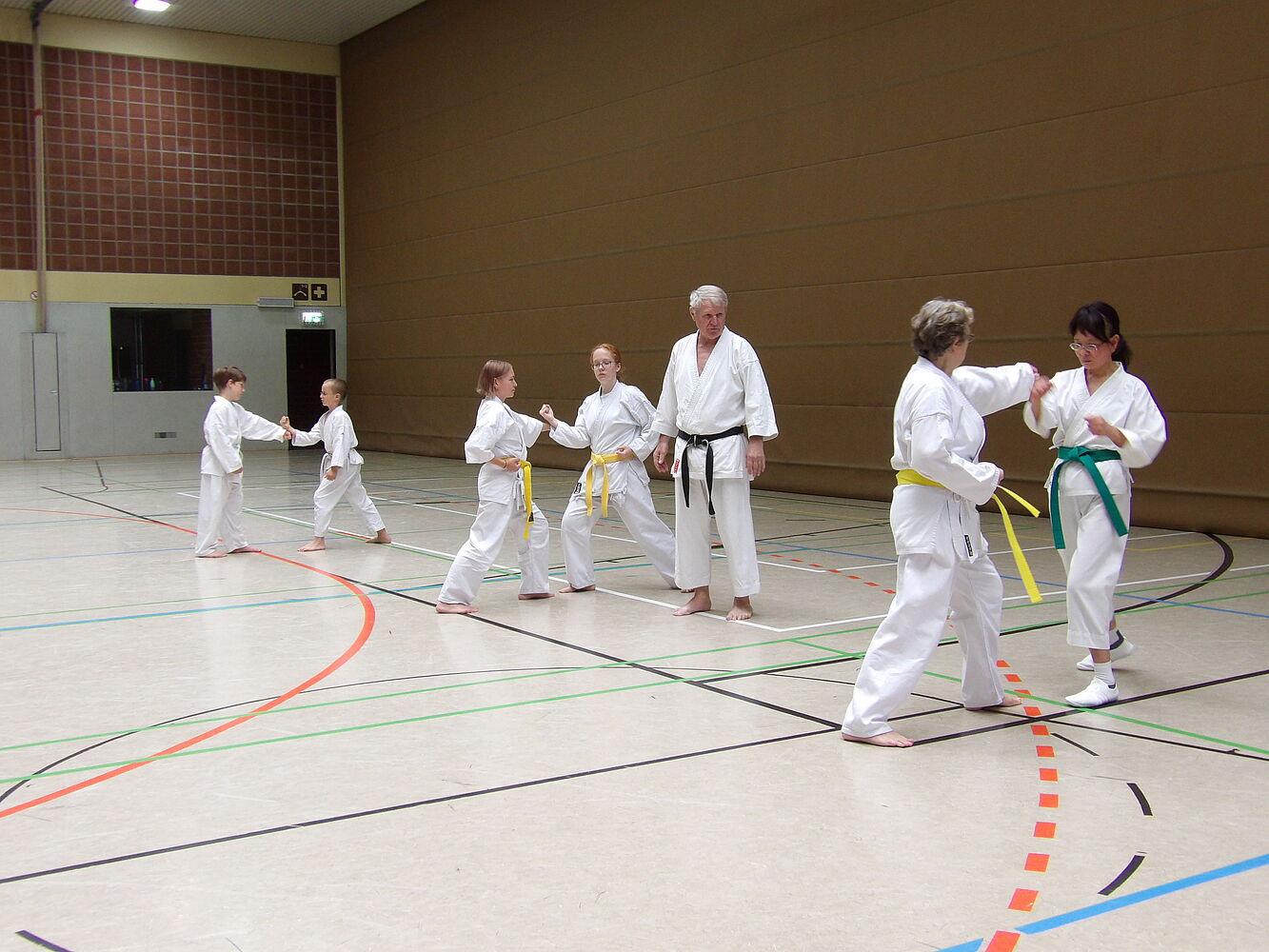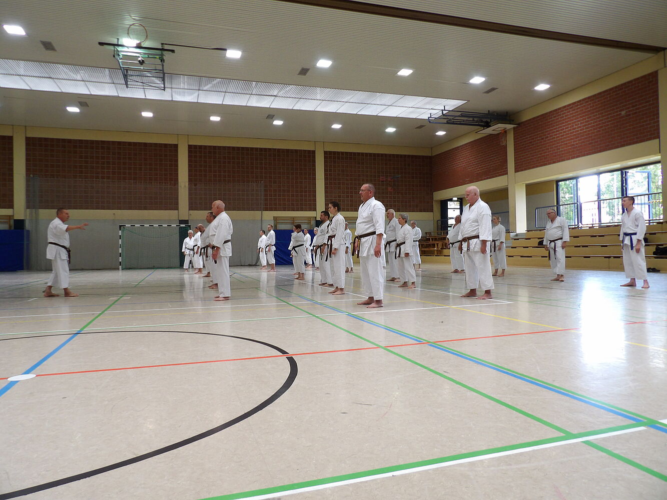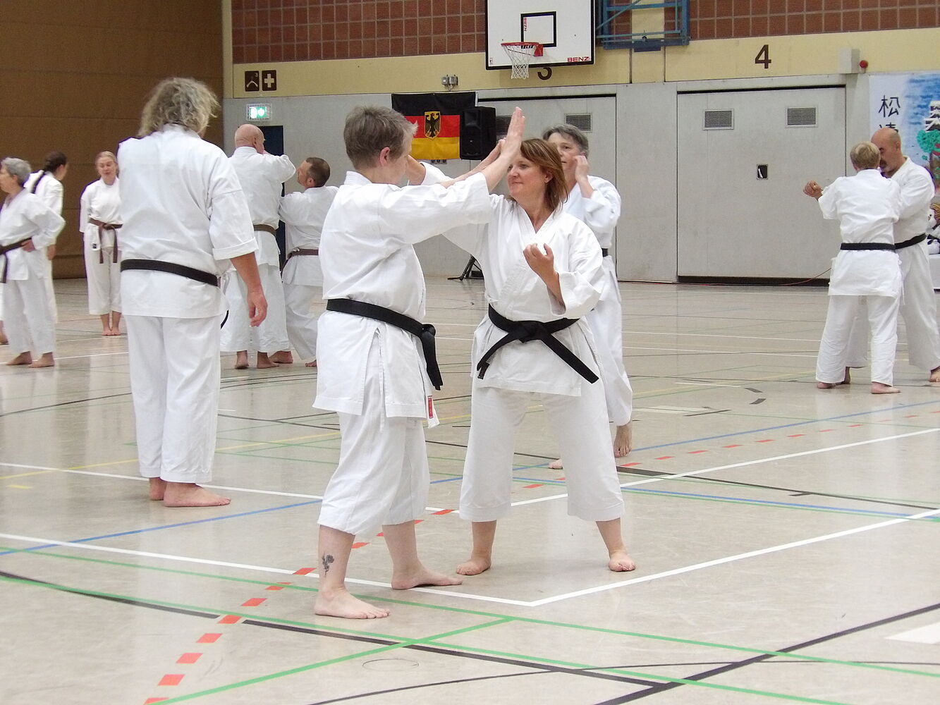 Sodann begann der Hauptpunkt der Veranstaltung, ein vom Deutschen Karate Verband e.V. bundesweit ausgeschriebener Lehrgang mit Großmeister Lothar Josef Ratschke (8. Dan). Es wurden anspruchsvolle Karate-Kombinationen und deren effektive Anwendung in unterschiedlichen Kampfsituationen geübt. Besonderer Wert wurde auf die gesundheitsbewusste und biomechanisch korrekte Ausführung der einzelnen Bewegungen gelegt. In der Oberstufe lag der Trainingsschwerpunkt auf der Kata Jion ('Liebe und Gnade') in der Unterstufe wurden Heian Shodan und Heian Nidan geübt.