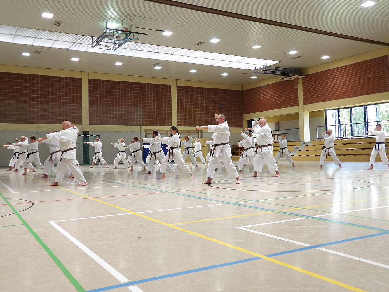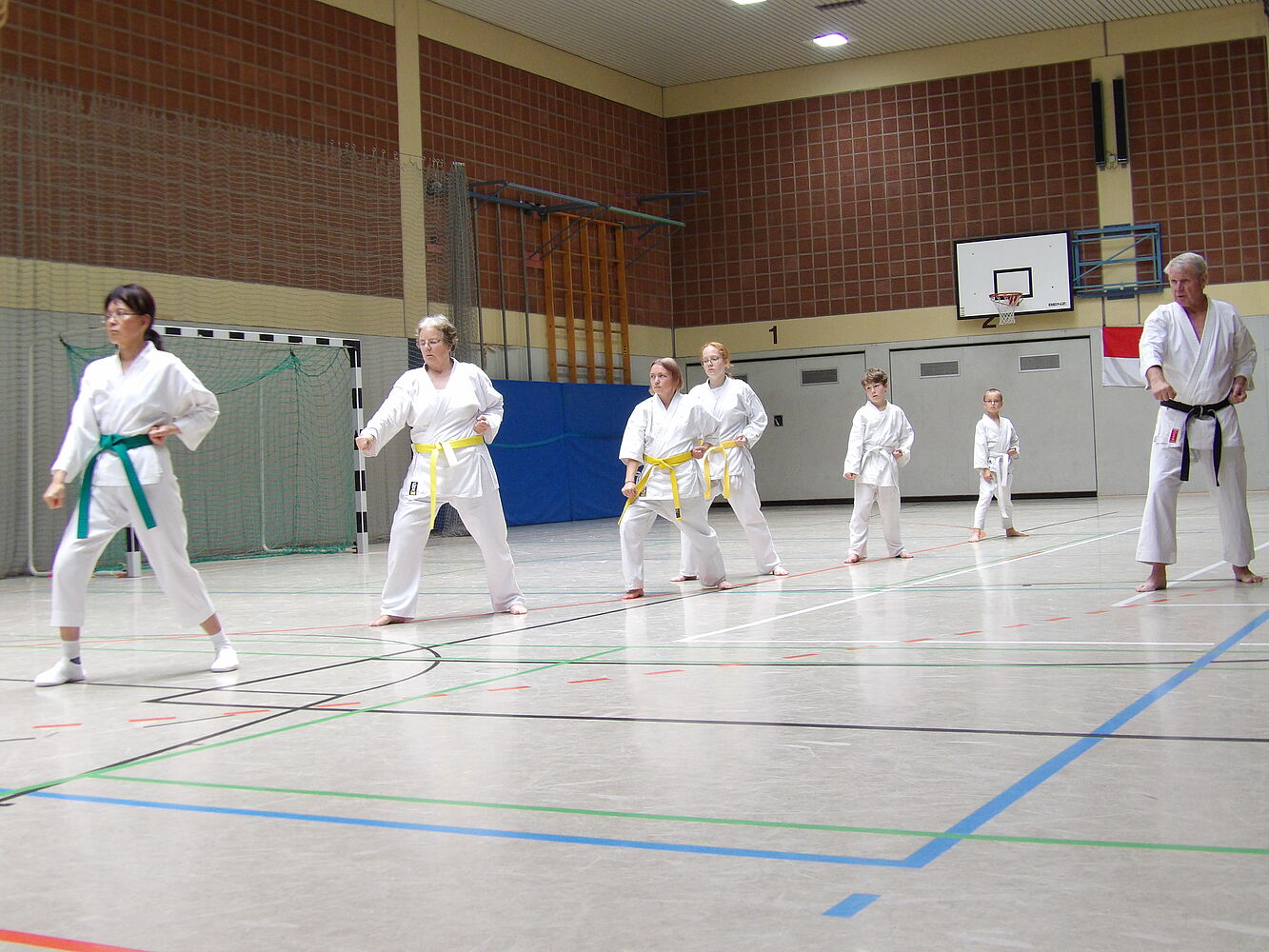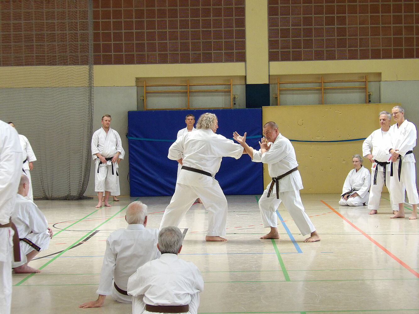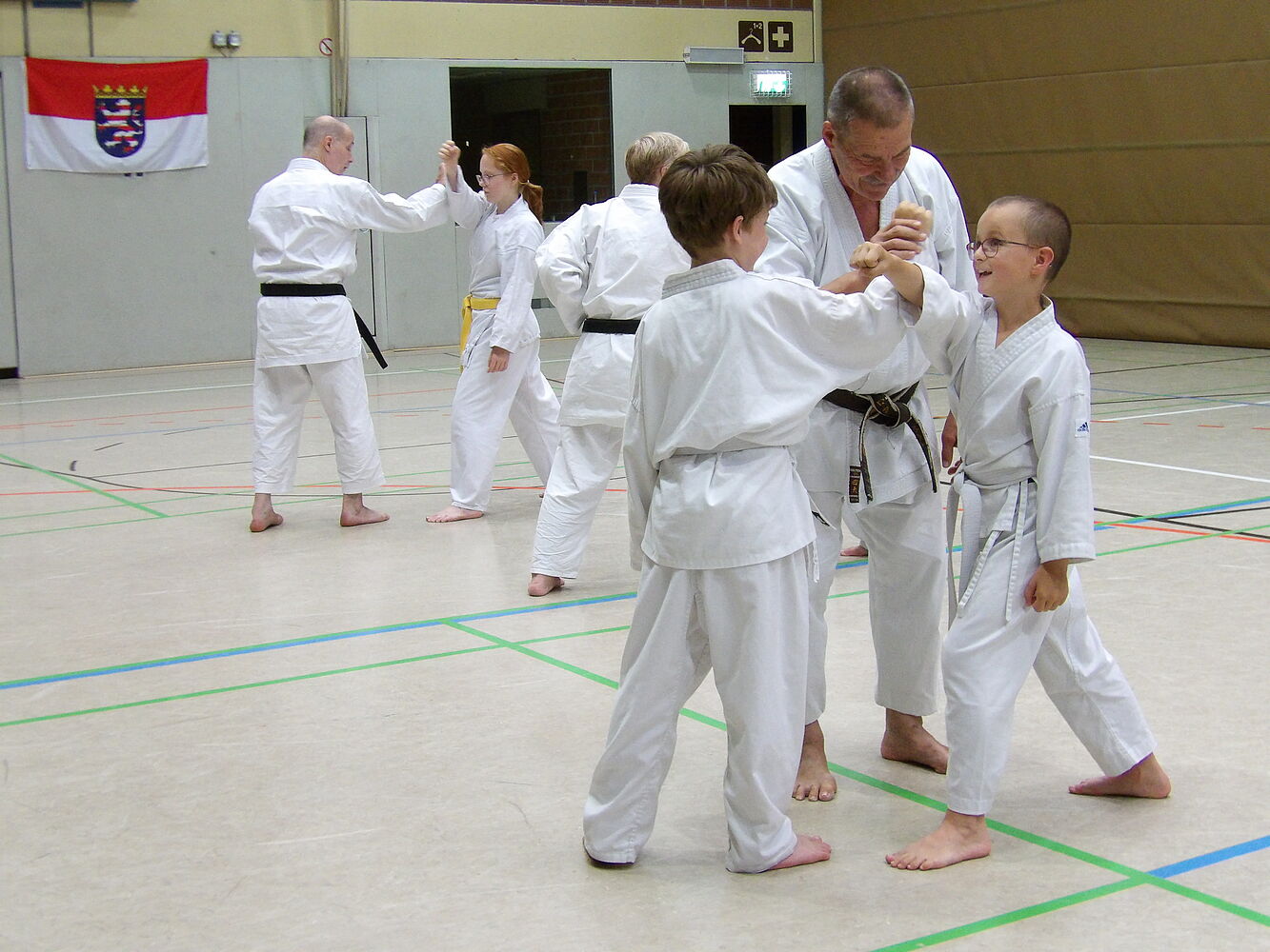 Sodann begann der Hauptpunkt der Veranstaltung, ein vom Deutschen Karate Verband e.V. bundesweit ausgeschriebener Lehrgang mit Großmeister Lothar Josef Ratschke (8. Dan). Es wurden anspruchsvolle Karate-Kombinationen und deren effektive Anwendung in unterschiedlichen Kampfsituationen geübt. Besonderer Wert wurde auf die gesundheitsbewusste und biomechanisch korrekte Ausführung der einzelnen Bewegungen gelegt. In der Oberstufe lag der Trainingsschwerpunkt auf der Kata Jion ('Liebe und Gnade') in der Unterstufe wurden Heian Shodan und Heian Nidan geübt.