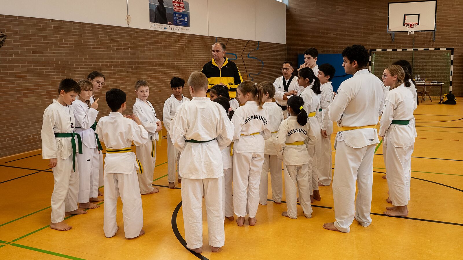 Unter den Augen des Prüfers, Großmeister Carsten Gauger (6. Dan Taekwondo) aus Bensheim stellten sich 20 Sportlerinnen und Sportler im Alter zwischen 7 und 16 Jahren den Anforderungen für den nächsten Kup-Grad und überzeugten dabei mit Disziplin, Technik und beeindruckendem Durchhaltevermögen.