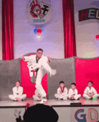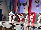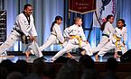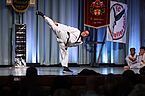 In intensiven zehn Minuten zeigte unsere Gruppe diverse Abwehr-, Schlag- und Tritttechniken, Formenläufe sowie freie Übungskämpfe vor den staunenden Augen der Zuschauer. Zum Abschluss flogen dann die Kicks des Meisters persönlich - mit nahtlosem Übergang in den Spagat und unter dem Applaus des Saals.