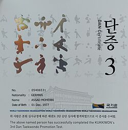 Einen Tag später erhielt er die offizielle Urkunde des Kukkiwon, dem Welt-Taekwondo-Hauptquartier in Seoul, Südkorea, und den dreifach gestreiften Schwarzgurt.