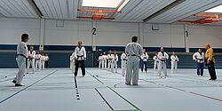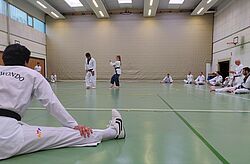 Nahtlos an die Gürtelprüfung der Kinder schloss sich dann um 12:30 Uhr nach dem Aufwärmtraining der Lehrgang für die 21 jugendlichen und erwachsenen Taekwondo-Schülerinnen und -Schüler an.