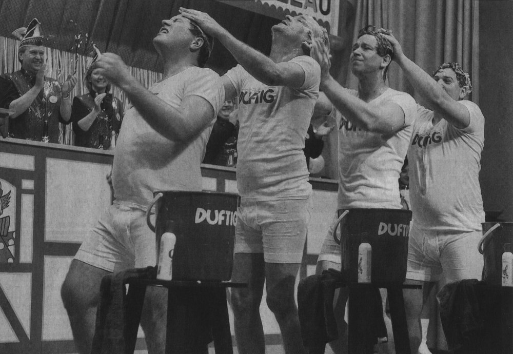 Nass wurde der Elferrat beim nächsten Programmpunkt. Vier gestandene Goller Männer in adretter Unterwäsche führten die Endausscheidung im Synchronhaarwaschen vor. Zu heißer Musik wurde der eingeseifte Kopf in eine wassergefüllten Eimer versenkt, dann folgte durch kräftiges Schütteln die Dusche in Richtung Präsidenten.
