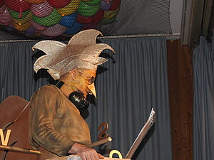 Einen ganz besonderen Auftritt hatte Ralf Schuchmann. Als "Kirchengockel" mit toller Aussicht auf sein Heimatort Golle hatte er den sich in der Renovierung befindlichen Kirchenturm nachgebaut und krähte alle Neuigkeiten und Wissenswertes von seinem Turm während im der Wind durch "sein Geläut bläst". Ein genialer Vortrag, der wie immer von diesem Vollblut-Fastnachter selbst geschrieben wird. Ralf überrascht die Fastnachter stets mit neuen Ideen, genialen Kulissen und Outfits. "Schuchi" wurde hier unter anderem vom Präsident für 33 Jahre Mitwirkung bei der Goller Fastnacht geehrt und mit Standing Ovation verabschiedet - natürlich mit dem Wunsch auf ein Wiedersehen.