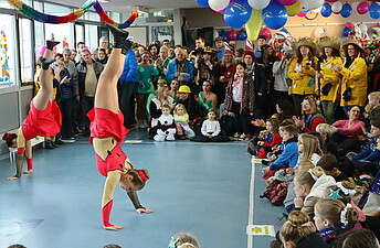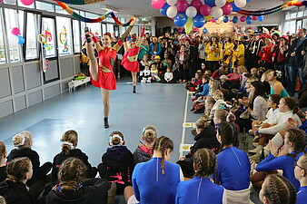 Im Rathaus zeigten die Gardetanzgruppen aus den verschiedenen Stadtteilen ihr Können. Das Garde-Duo Jana und Virginia vom TSV Goddelau begeisterte mit ihrem akrobatischen Tanz die Zuschauer. Das etwa einstündige Programm endete mit Stimmungs- und Schunkelliedern. Die Fastnachter waren begeistert von der gelungenen Premiere.