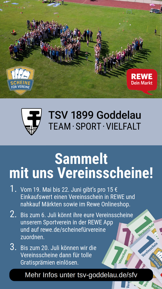 Bereits zum vierten Mal beteiligte sich der TSV Goddelau an der deutschlandweiten REWE-Aktion „Scheine für Vereine“. Hierbei konnten REWE-Kunden bei ihrem Einkauf sog. Vereinsscheine sammeln und ihrem Wunschverein zuordnen. Mitglieder und Unterstützer des TSV Goddelau sammelten in diesem Jahr insgesamt 6043 Vereinsscheine, die der TSV dann in Prämien aus einem Prämienkatalog umwandeln konnte.