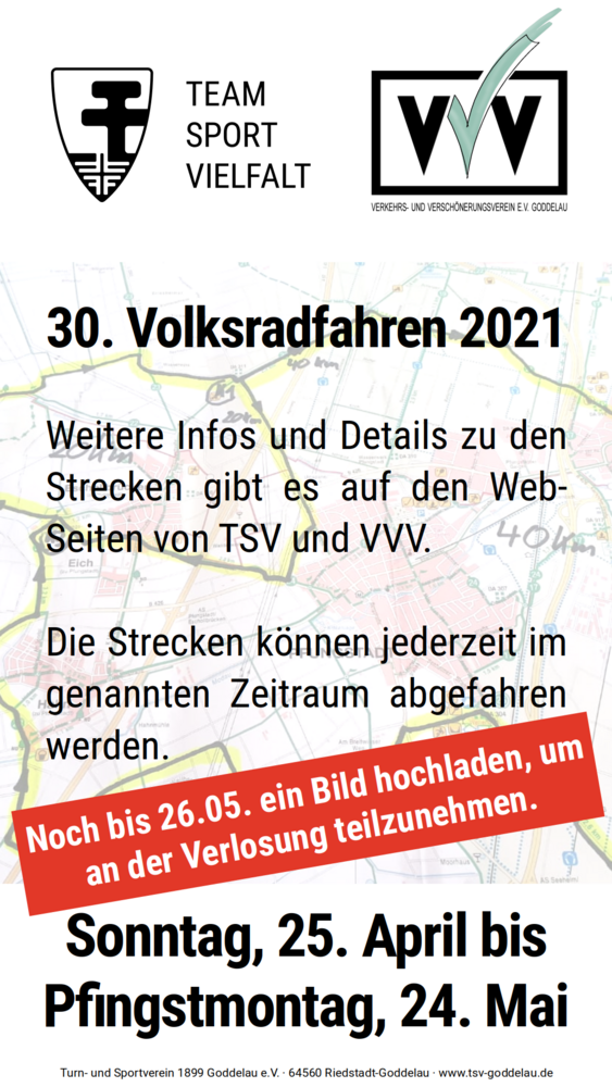 Und wer dazu auch noch ein „Beweisfoto“ von der Tour hier bis zum 26.05.2021 hochlädt und nicht dem Vorstand des TSV oder des VVV angehört, nimmt an einer kleinen Verlosung teil.
