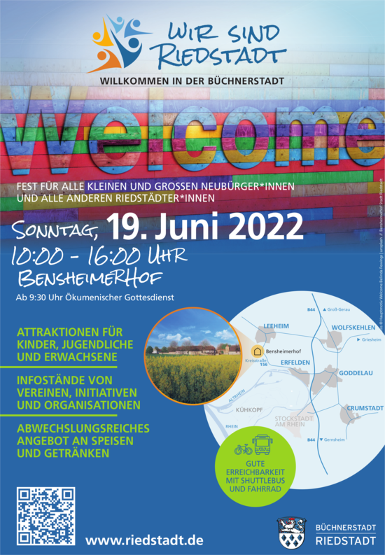 Beim Willkommensfest der Stadt Riedstadt am 19. Juni 2022 auf dem Bensheimer Hof ist auch der TSV Goddelau mit einem Info-Stand dabei. Zum Toben steht unser Trampolin für die kleinen Besucher bereit und beim Bühnenprogramm treten unsere beiden Tanzgruppen Weedels und Cheers auf.
