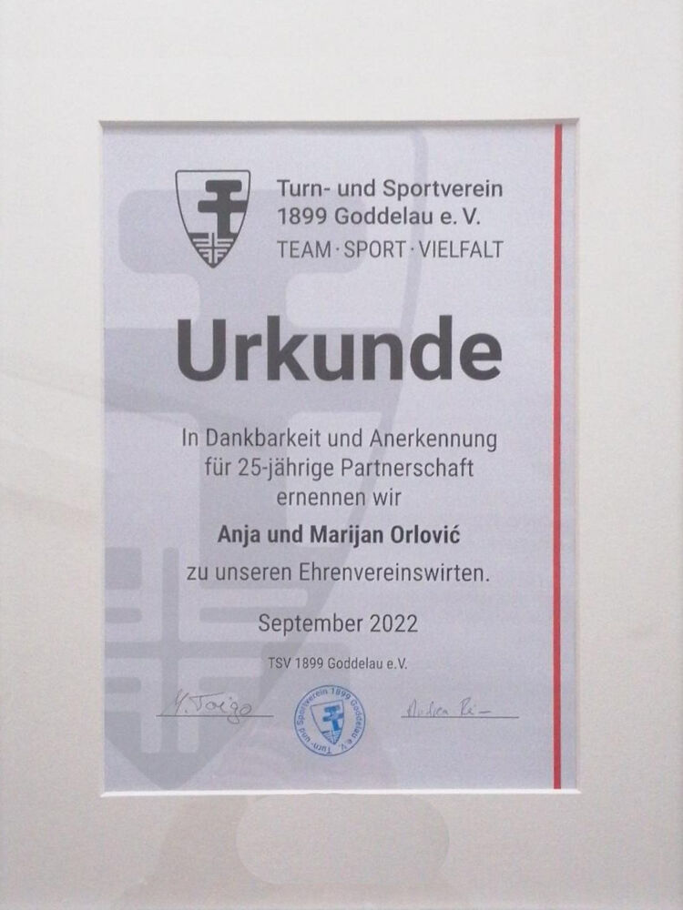 Seit 25 Jahren bewirtschaftet Familie Orlovic mit dem Restaurant Dalmatia das Sportheim des TSV Goddelau. Dies ist in der heutigen Zeit nicht mehr selbstverständlich. Im Rahmen einer Ehrungsfeier im TSV-Sportheim wurden Anja und Marijan (Marinko) Orlovic von den beiden Vereinsvorsitzenden Michael Toigo und Andrea Reim zu „Ehrenvereinswirten“ ernannt.