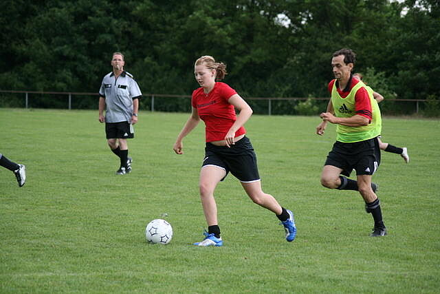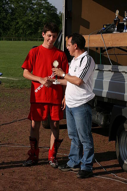 Erfreulich war, dass es durchweg faire Spiele waren und auch zwischendurch einsetzender Regen die Laune nicht trübte. So war die Hüpfburg vor und nach der Regenpause genauso beliebt, wie das Spielmobil des Kinderschutzbundes. Auch von einer kurzfristig organisierten Tombola wurde reichlich Gebrauch gemacht. Das Torwandschießen gewann Ruben Kiroff im Stechen gegen Martin Schulz. Bei den Kindern sorgte Robin Borger mit 4 Treffern für einen neuen Rekord und erhielt ebenfalls einen Pokal. Als fairste Mannschaft wurde das Manndeckerteam ausgezeichnet. Nach der Siegerehrung sorgte die Gruppe „Soundwave“ für Stimmung und es wurde bis nach Mitternacht das Tanzbein geschwungen.