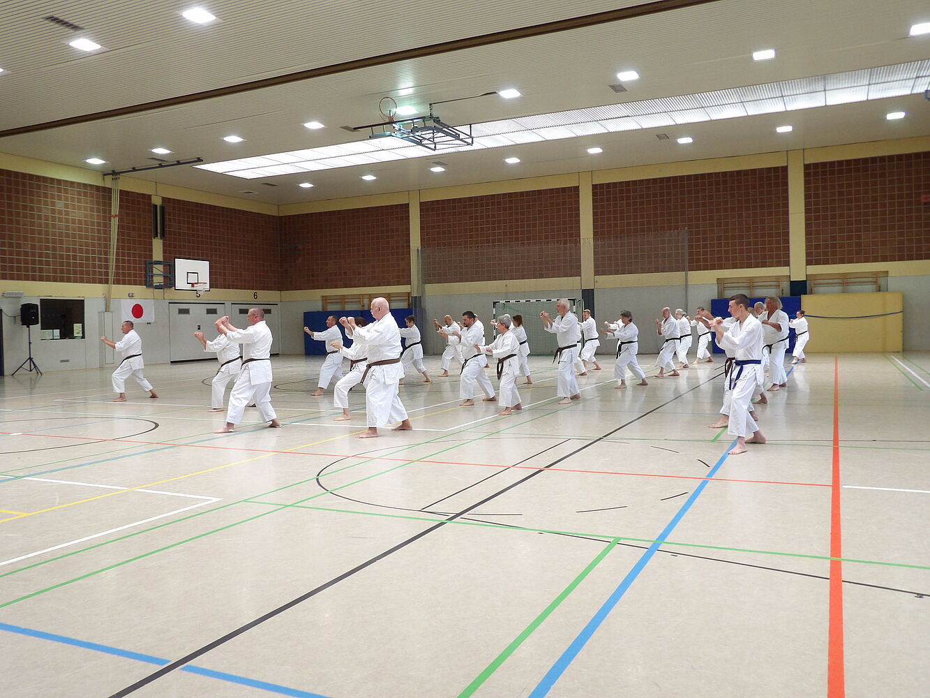 Sodann begann der Hauptpunkt der Veranstaltung, ein vom Deutschen Karate Verband e.V. bundesweit ausgeschriebener Lehrgang mit Großmeister Lothar Josef Ratschke (8. Dan). Es wurden anspruchsvolle Karate-Kombinationen und deren effektive Anwendung in unterschiedlichen Kampfsituationen geübt. Besonderer Wert wurde auf die gesundheitsbewusste und biomechanisch korrekte Ausführung der einzelnen Bewegungen gelegt. In der Oberstufe lag der Trainingsschwerpunkt auf der Kata Jion ('Liebe und Gnade') in der Unterstufe wurden Heian Shodan und Heian Nidan geübt.