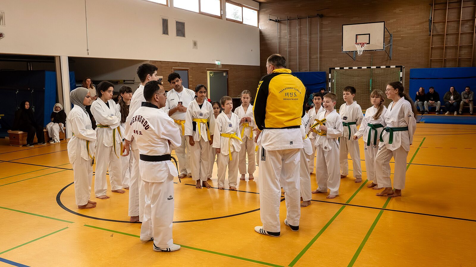 Unter den Augen des Prüfers, Großmeister Carsten Gauger (6. Dan Taekwondo) aus Bensheim stellten sich 20 Sportlerinnen und Sportler im Alter zwischen 7 und 16 Jahren den Anforderungen für den nächsten Kup-Grad und überzeugten dabei mit Disziplin, Technik und beeindruckendem Durchhaltevermögen.