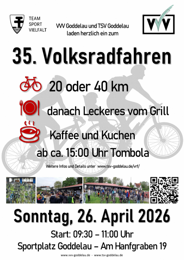 Die veranstaltenden Vereine TSV Goddelau und VVV Goddelau laden alle Velofahrer und Biker ein, in den Sattel zu steigen. Am Sonntag, den 26. April 2026, findet das 35. Volksradfahren statt. Für die Durchführung der Veranstaltung sind wir dankbar für jede helfende Hand. Meldet euch bitte bei helfer@tsv-goddelau.de per Mail.